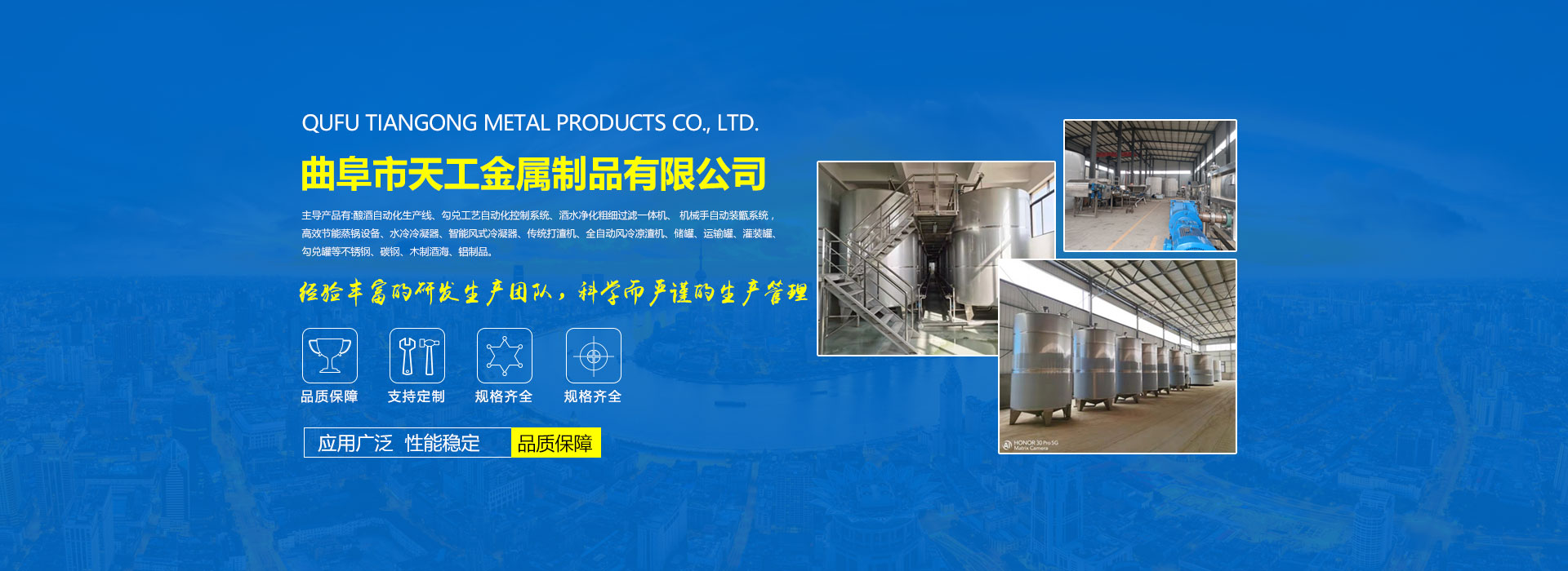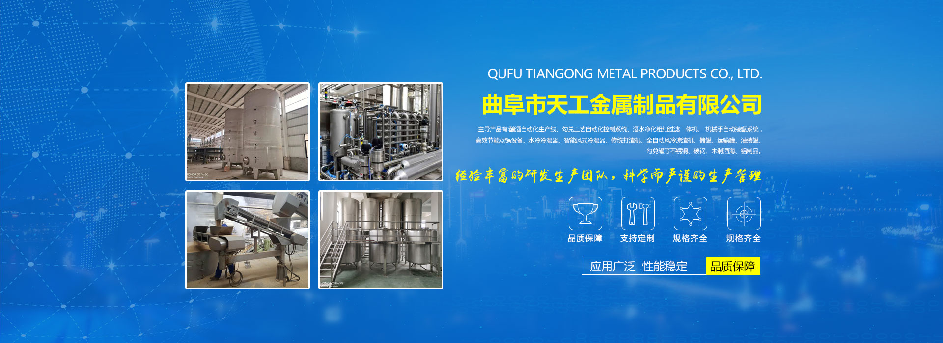 本公司是專業(yè)生產(chǎn)不銹鋼酒罐、不銹鋼釀造設(shè)備、不銹鋼發(fā)酵罐、釀酒、食品、生物、化工、環(huán)保設(shè)備、制藥設(shè)備的廠家。主導(dǎo)產(chǎn)品有:釀酒自動(dòng)化生產(chǎn)線、勾兌工藝自動(dòng)化控制系統(tǒng)、酒水凈化粗細(xì)過濾一體機(jī)、?機(jī)械手自動(dòng)裝甑系統(tǒng),高效節(jié)能蒸鍋設(shè)備、水冷冷凝器、智能風(fēng)式冷凝器、傳統(tǒng)打渣機(jī)、全自動(dòng)風(fēng)冷涼渣機(jī)、儲(chǔ)罐、運(yùn)輸罐、灌裝罐、勾兌罐等不銹鋼、碳鋼、木制酒海、鋁制品。各種反應(yīng)釜、發(fā)酵罐、提取罐、氣體混合罐、烘干設(shè)備等大中型設(shè)備安裝,平臺(tái)制作、工藝管線制作安裝,容器設(shè)備內(nèi)外防腐保溫。產(chǎn)品規(guī)格齊全,質(zhì)量可靠。